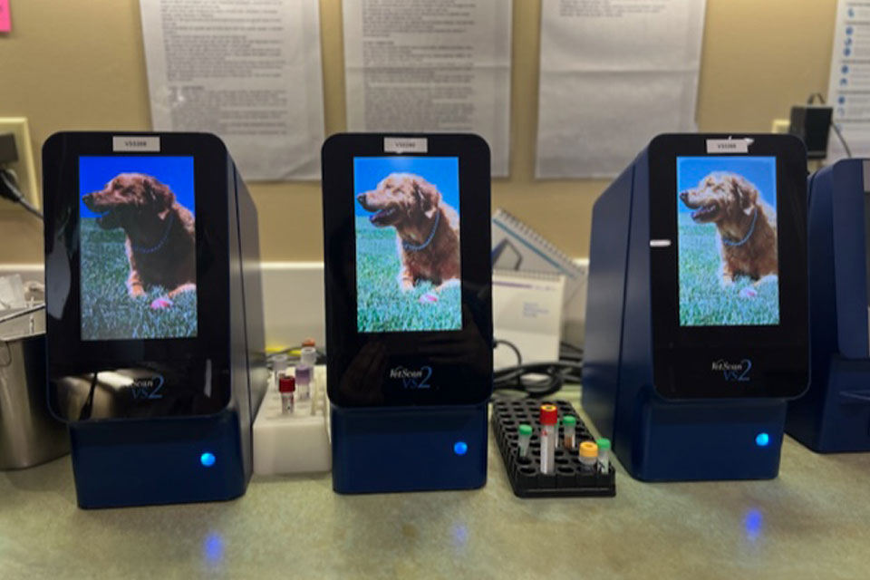 Blood work provides information about your pet’s internal organ functions, hydration status, clotting ability, immune function, infection status, and more. Wellness blood profiles are sent to our external reference laboratory that provides results in only a few days. By repeating the same blood panel each year, we can track trends over time and detect changes sooner. The reference lab also handles many other sample types, including biopsies, infectious disease tests, and parasite screens. For sick pets, minutes and hours matter. We can obtain complete blood panels in only a few minutes from our in-house laboratory, start a same-day treatment plan, and get your pet on the road to recovery.