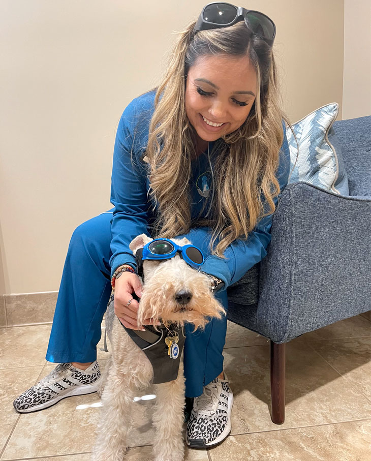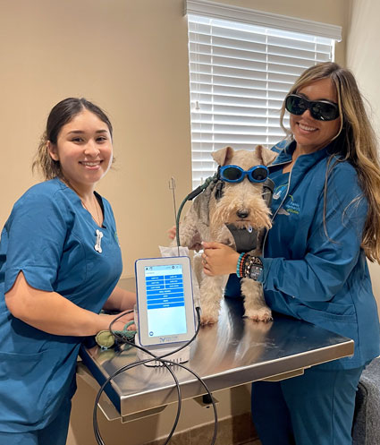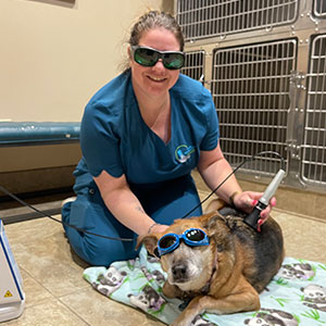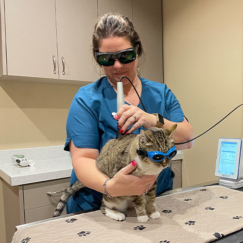 During a laser therapy session, you, your pet, and our team member operating the laser must wear protective goggles to prevent inadvertent laser beam damage. A session involves our specially trained team member moving the laser probe continuously across the treatment area while your pet relaxes comfortably. Treatments are repeated several times weekly at first, and then less frequently as your pet improves.